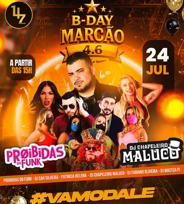 Fiesta de Cumpleaños de Marcão — DJs e invitados especiales — ‘Proibidas Funk’ en vivo — DJ Chapeleiro Maluco — Celebrando los 4.6 con estilo.